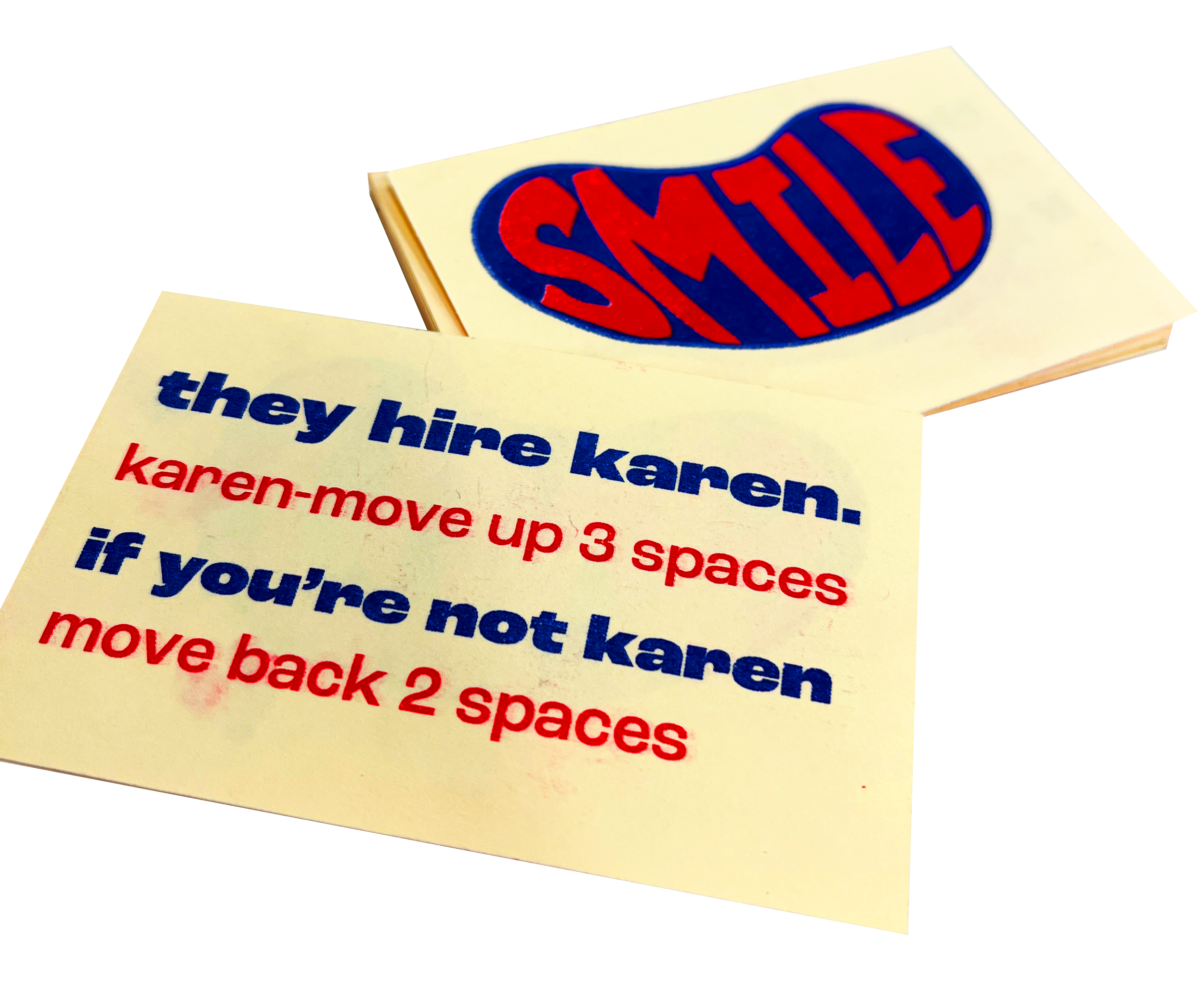 The way I envisioned this working is by having 3 characters for people to choose from, each player will then roll the dice to determine how many spaces they will move. They have to stop moving once they hit a “job” space and pull a job card. There will be 3 different job cards, one card is clearly meant for Gus, one is clearly for Taylor and the third is for either Gus or Taylor- however, all instances will benefit Karen. After the 3 job cards, there will be a couple of cards telling the players to just skip to the end because I don't expect people to sit and play an hour-long board game at an exhibit, and the premise is pretty clear early on.